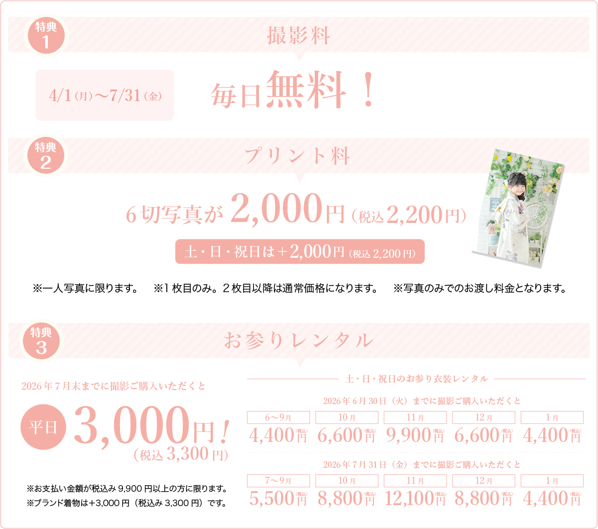 お子様の健やかな成長を願う七五三で素敵なお写真を。多彩な衣装、豊富な特典をご用意しております。